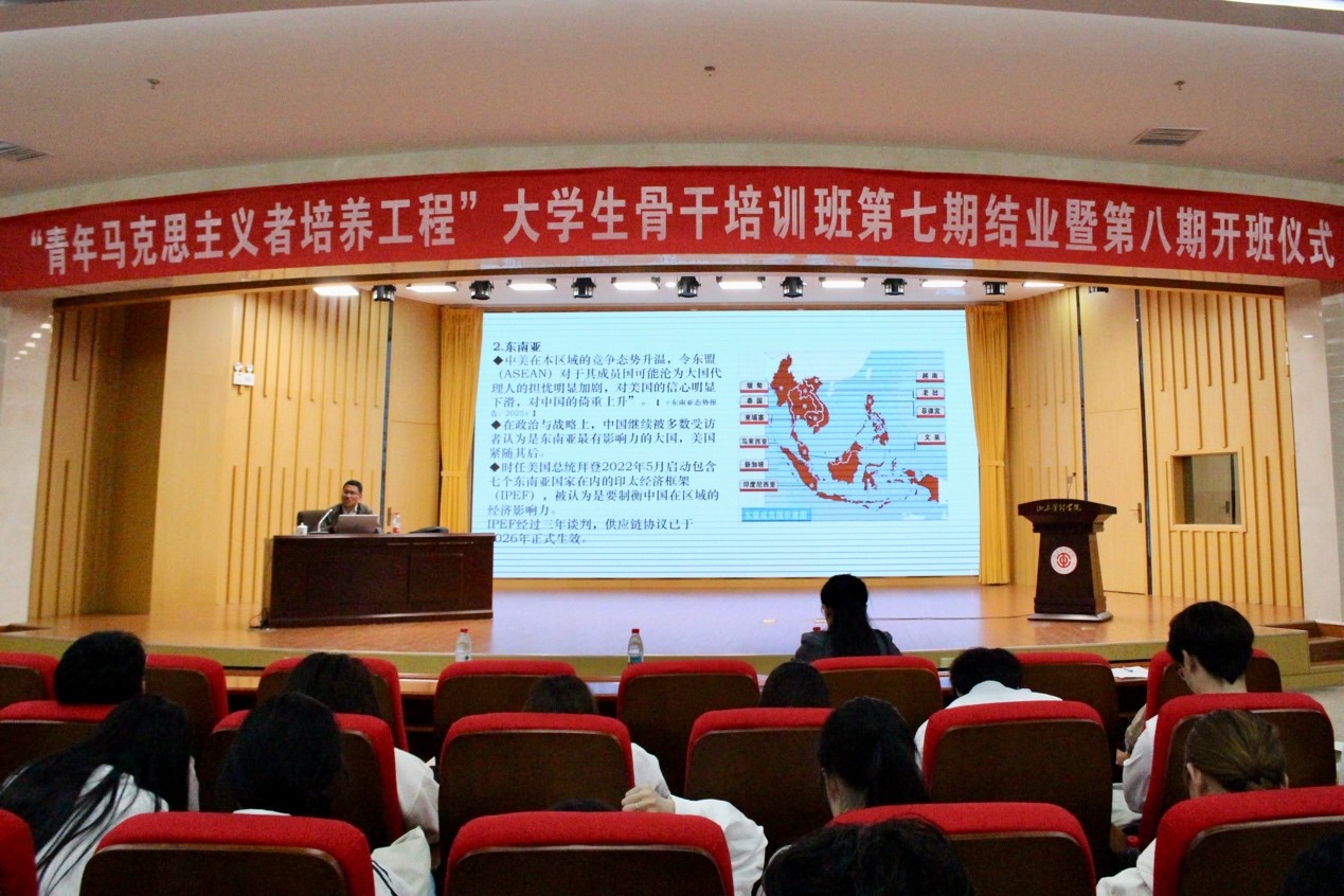 开班仪式后,山东青年政治学院教授王发龙给第八期青马班学员进行第一次集中授课。王发龙以《筑牢国家安全防线 书写青年担当答卷——关于中国周边安全形势的认识与思考》为题,详细讲述了当前中国周边安全形势的复杂性与主要挑战,引导学员们深刻认识国家安全的重要性,激发维护国家安全的责任感与使命感。
