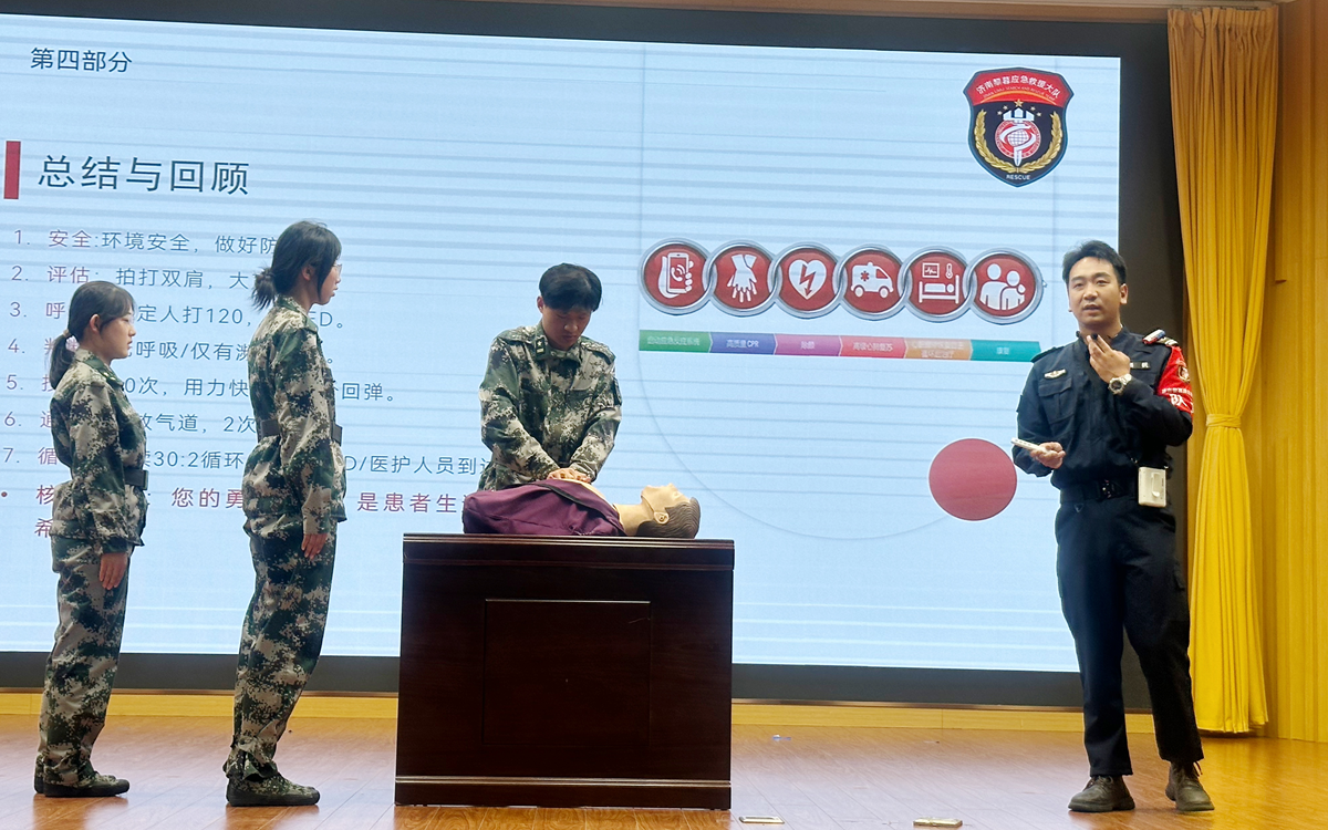 为切实增强学生安全防护与自救互救能力,学院邀请黎暮应急救援队走进课堂,开展心肺复苏(CPR)、气道异物梗阻急救等实用技能培训。救援队队员通过分步讲解、标准动作演示和现场指导,帮助学生从“知道”到“会做”,真正掌握在危急时刻保护自己、帮助他人的基本能力。多名新生踊跃上台参与实操,在真实模拟中提升应急处理意识和实战水平。