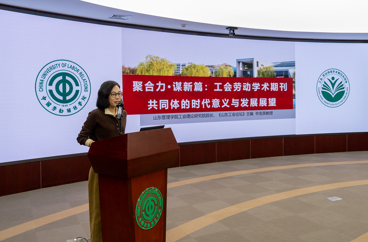 在学术交流环节,我校《山东工会论坛》主编辛宝英以《聚合力·谋新篇:工会劳动学术期刊共同体的时代意义与发展展望》为题作主旨发言,深入分析共同体成立的时代意义,提出发挥共同体作用的实践路径,希望共同体为中国工人阶级和工运事业的蓬勃发展,贡献不可替代的、独特的学术力量。