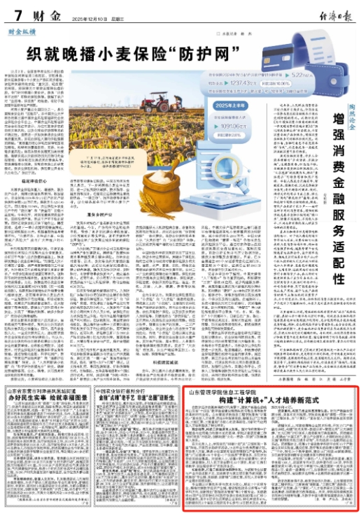 12月10日,《经济日报》以《山东管理学院信息工程学院构建“计算机+”人才培养新范式》为题,对我校信息工程学院在数字经济背景下,紧扣国家产教融合战略与山东省数字强省建设规划,历经8年探索形成的“三育铸魂、三链汇聚、三维重构”核心改革路径,以及在复合型人才培养、产教协同创新、资源整合赋能等方面的特色实践与显著成效进行了专题报道。
