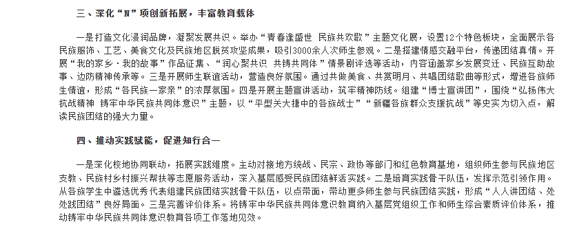 一是深化校地协同联动,拓展实践维度。主动对接地方统战、民宗、政协等部门和红色教育基地,组织师生参与民族地区支教、民族村乡村振兴帮扶等志愿服务活动,深入基层感受民族团结鲜活实践。二是培育实践骨干队伍,发挥示范引领作用。从各族学生中遴选优秀代表组建民族团结实践骨干队伍,以点带面,带动更多师生参与民族团结实践,形成“人人讲团结、处处践团结”良好局面。三是完善评价体系。将铸牢中华民族共同体意识教育纳入基层党组织工作和师生综合素质评价体系,推动铸牢中华民族共同体意识教育各项工作落地见效。
