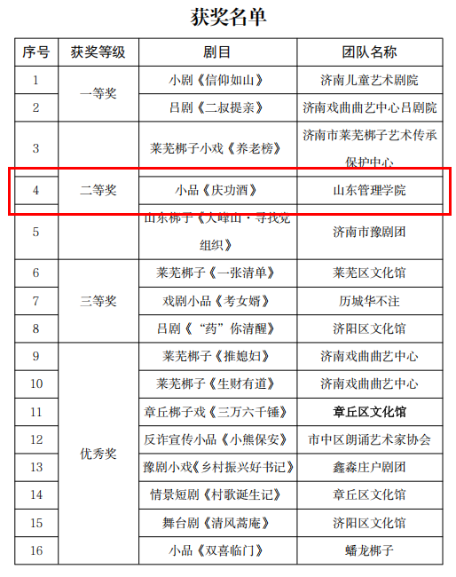 11月28日,由中共济南市委宣传部、中共济南市委社会工作部、济南市文学艺术界联合会、济南市农业农村局、济南市文化和旅游局联合举办的“乡风文明”济南市小戏小剧展演活动颁奖晚会举办,我校艺术学院选送的小剧《庆功酒》从全市参赛的90余个作品中脱颖而出