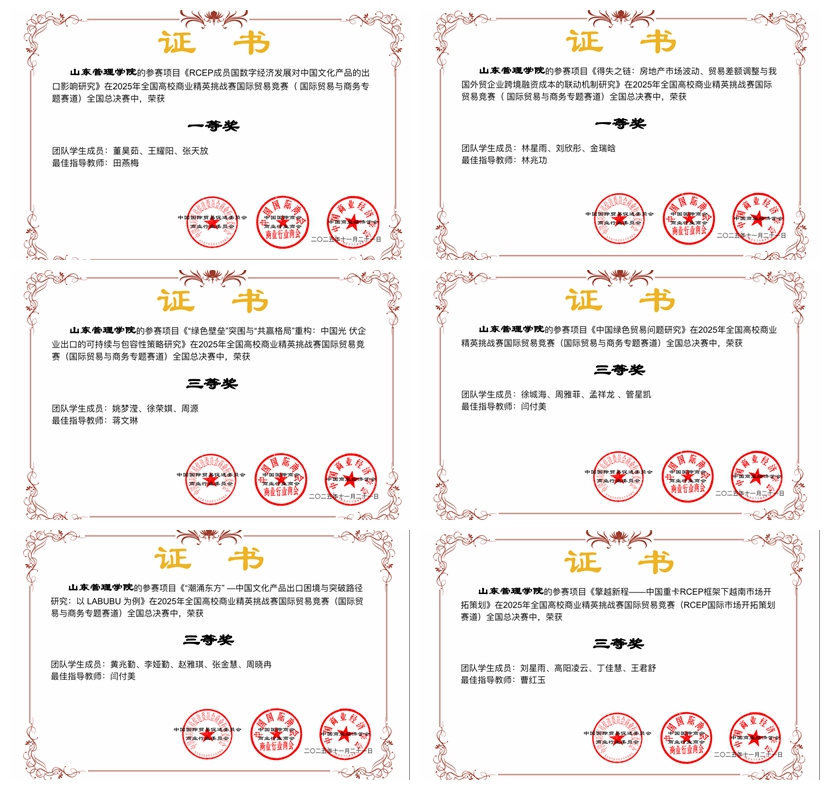 近日,2025年全国高校商业精英挑战赛国际贸易竞赛(RCEP 国际市场开拓策划赛道、国际贸易与商务专题赛道)全国总决赛落下帷幕,我校经贸学院2023级、2024级国际经济与贸易专业的6支参赛团队凭借扎实的专业知识和实践能力获国际贸易与商务专题赛道一等奖2项、三等奖3项及RCEP国际市场开拓策划赛道三等奖1项的优异成绩,指导教师田燕梅、林兆功、闫付美、曹红玉、蒋文琳获“优秀指导教师”称号。