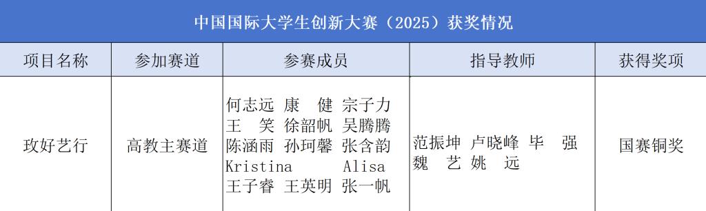 近日,由教育部等12个部门主办的中国国际大学生创新大赛(2025)总决赛圆满落幕。我校参赛项目《玫好艺行》荣获国赛铜奖,这是我校连续第二年在该赛事中获得国赛奖项,也是首次在高教主赛道中获奖。