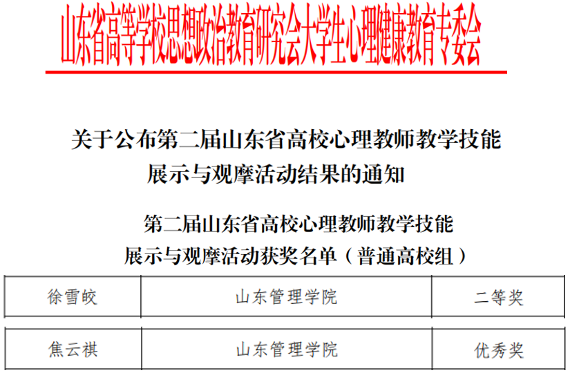 近日,由山东省高等学校思想政治教育研究会大学生心理健康教育专业委员会主办的第二届山东省高校心理教师教学技能展示与观摩活动举办。我校艺术学院心理辅导员徐雪皎、学生工作部心理中心专职教师焦云祺凭借出色表现分别获得二等奖和优秀奖。