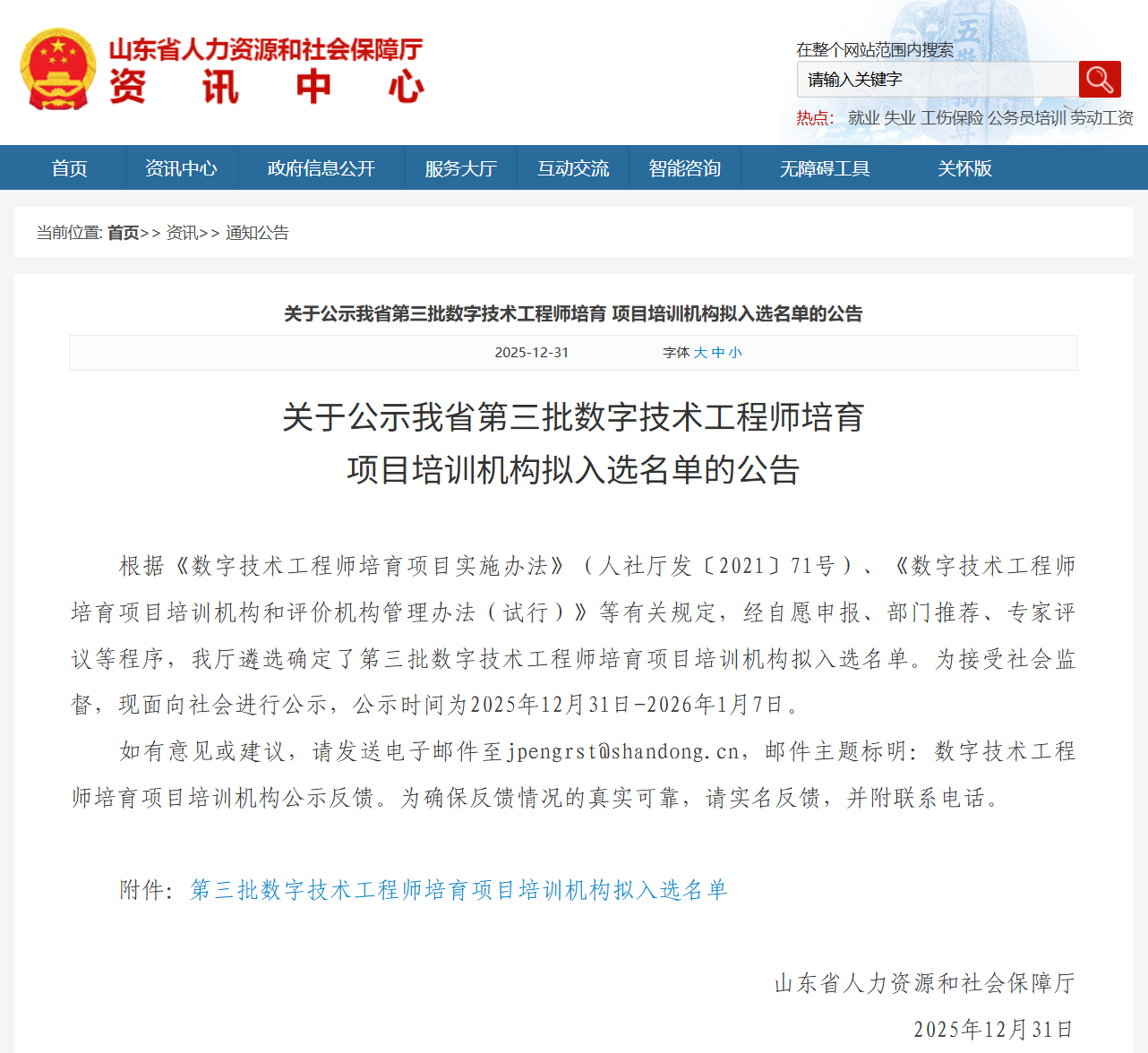 近日,山东省人力资源和社会保障厅公示了第三批数字技术工程师培育项目培训机构拟入选名单,经严格遴选,山东管理学院申报的“人工智能工程技术人员”“大数据工程技术人员”两个项目成功入选,培训等级涵盖初、中、高级,有效期3年。