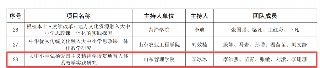 近日,2025年山东省思想政治教育教学改革项目立项结果公布,我校马克思主义学院李冰冰副教授申报的《大中小学弘扬爱国主义精神学段贯通育人体系教学实践研究》课题获批立项。